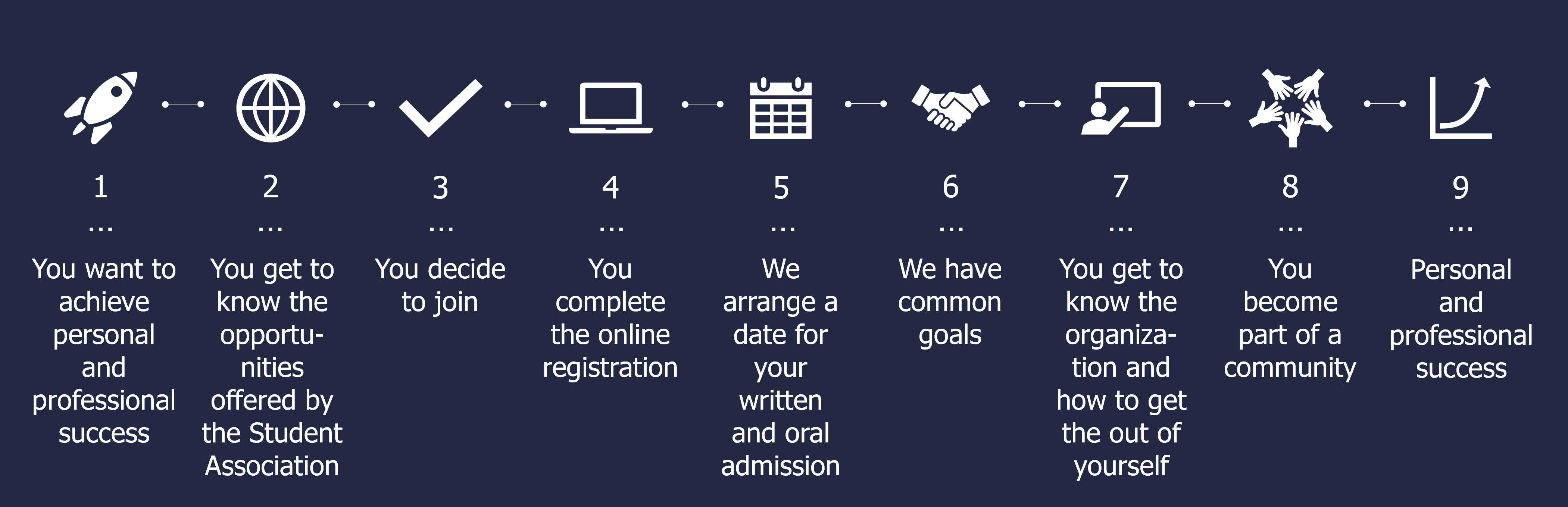 New members participate in a structured onboarding process that includes both formal and informal integration elements (such as movie and pizza nights, outdoor cooking). The formal onboarding involves Student Association Departments' introductory sessions, mentor allocation, orientation to the organisational structure, and introduction of possibilities to active participation in community and academic programmes.